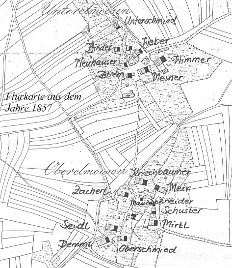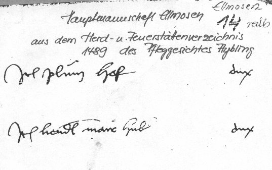 Das älteste Zeugnis der Ortsgeschichte ist ein römischer Grabstein, der 1808 von der Nordwand der Kirche entfernt und ins Nationalmuseum nach München gebracht wurde. Ale "Olemos" wird Ellmosen erstmals 1300 urkundlich erwähnt, 1344 dann als "Olmosen". Die gut nachbarschaftlichen Beziehungen zu Aibling reichen offenbar weit in die Geschichte zurück. Bis 1482 befand sich das Pfarrwidum des Aiblinger Pfarrers in Ellmosen, woran noch heute der Hausname "Beim Wimmer" erinnert. Ein alter Dorfplan (1857), sowie ein Auszug aus einer Chronologie (1489) des damaligen Amtsgerichts in "Aybling" liegen heute noch im Dorfe vor. Es gibt übrigens auch interessante Informationen über Ellmosen in der Bay.Landesbibliothek. Dort muss man nur mal nach dem Ortsnamen Ellmosen suchen. Schnon in der Landkarte von Apianus aus dem Jahre 1563 ist Ellmosen als Ort eingezeichnet (vgl. Skizzenblatt und Ausschnitt aus der auf Pergament gemalten Landkarte).