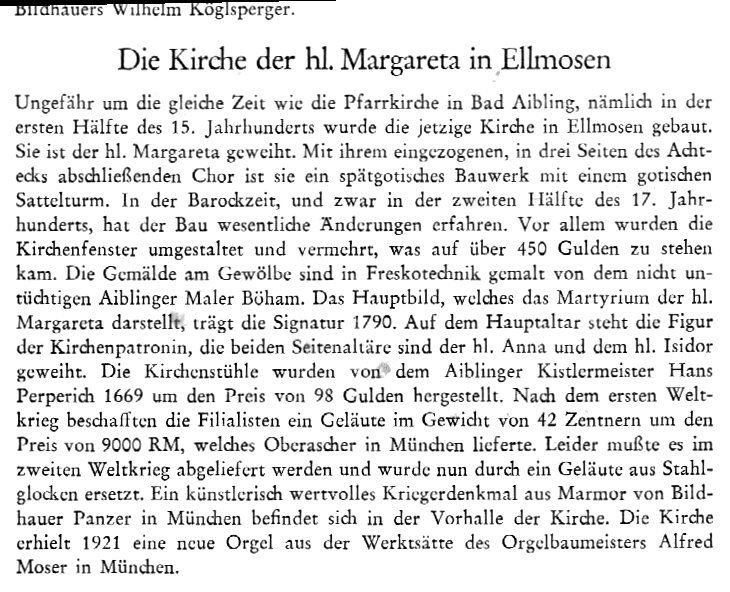 Katholische Pfarrkirche St.Margaretha in EllmosenIm Auftrag des Ordinariats der Erzdiozöse München und Freising wurde 1998 eine Dokumentation zur Bau-, Ausstattungs- und restaurierungsgeschichte der Kirche von Ellmosen erstellt. Die Dokumentation entstand unter Federführung der Historikerin Maria Hildebrandt und des Kunsthistorikers Dr.Stefan Nadler. Zusammenfassung: Historisch gesehen dürfte vermutlich ursprünglich in Ellmosen der Sitz der Pfarrei gewesen sein; angeblich erst 1484 soll die Verlegung des Pfarrsitzes nach Aibling erfolgt sein. Für die Stichhaltigkeit dieser Theorie spricht zum einen die Tatsache, daß sich in der Ellmosener Kirche ein Taufstein befindet, der wohl aus romanischer Zeit stammen dürfte; zum anderen wird noch 1874 Thann als Nebenkirche von Ellmosen bezeichnet, obwohl Ellmosen selbst seit Jahrhunderten Filiale von Aibling war. In früheren Zeiten wurden neben der hl.Margaretha auch die hll. Ulrich und Martin als (Neben-) Patrone der Kirche genannt. Der unverputzte Tuffquaderbau der heutigen Kirche dürfte in seiner Bausubstanz - mit Ausnahme des sicher noch älteren Turmes - im wesntlichen aus dem 14.Jhdt stammen. Nachrichten zum Bau liegen erst aus dem 17.Jhdt vor. So erhielt die Kirche 1601 einen neuen Glockenstuhl, der interessanterweise aus dem Holz von Apfelbäumen verfertigt wurde. Ein Inventar von 1653 nennt drei Glocken. Ab 1663 erfolgt in mehreren Schritten eine Barockisierung der Kirche. |
